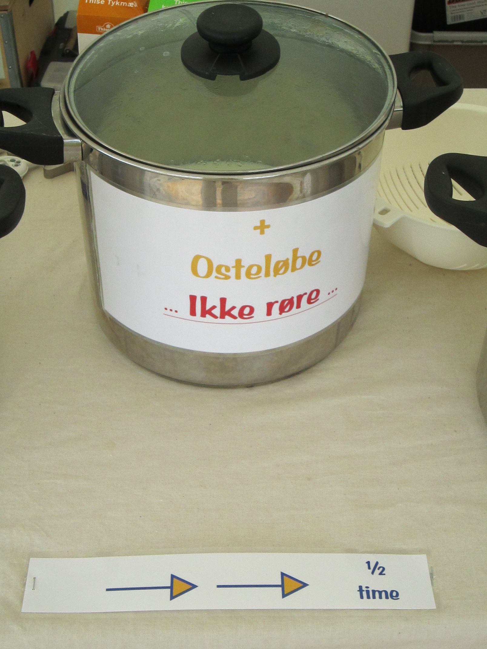 Efter ½ time tilsættes osteløbe, cirka 1 ml per 4 liter mælk. Læg låget på og håndklæde over for at temperaturen holdes bedst muligt. |