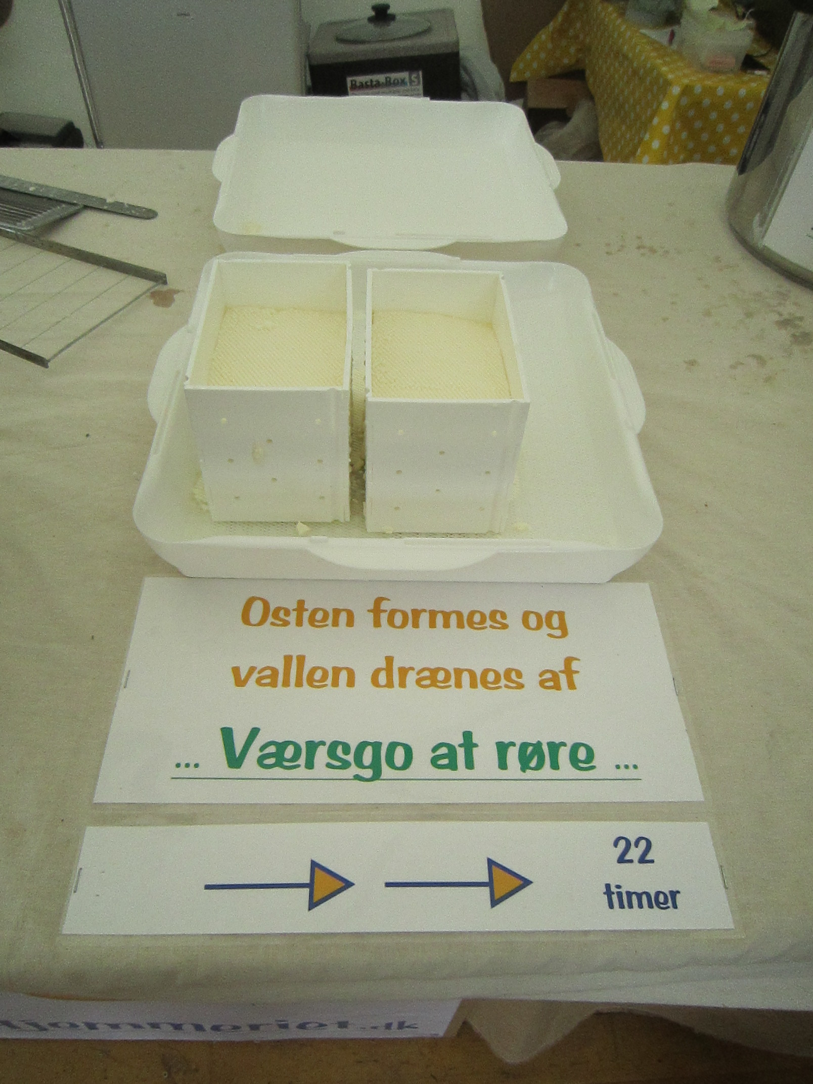 Når ostemassen har drænet og er vendt over cirka 1 døgn vil der ikke drænes mere valle fra ostemassen. Ved at starte ostefremstillingen en morgen, så vil dette stadie være nået den efterfølgende morgen. Afdræningen har medført at havde man startet med 6-7 liter sødmælk ville man få cirka 1 kg afdrænet ostemasse. |