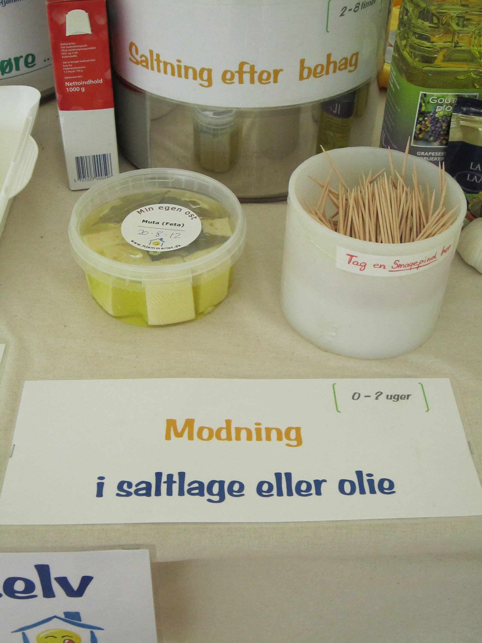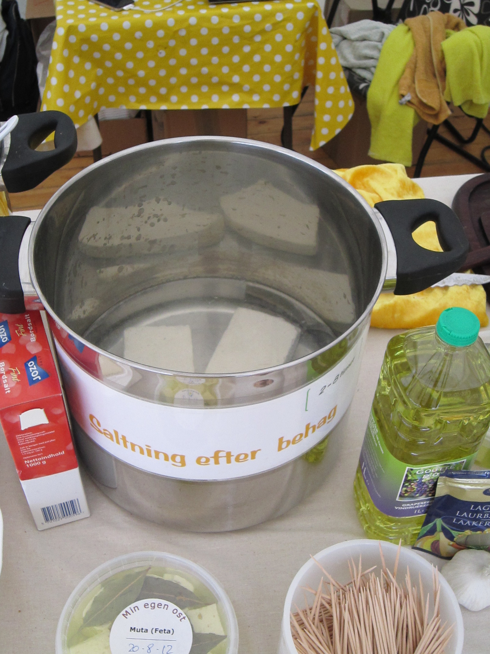 Efter saltningen lægges osteklumperne i en lage af vindruekerneolie tilsat snittet hvidløg og laurbærblade. Alternativt kan osten lægges i en mild saltlage tilsat lidt valle og lidt calciumklorid. Der er fri mulighed for smagsprægning her – brug de krydderier som du ønsker. Beholderen med osten i lage placeres på køkkenbordet og der står den resten af dagen, så der tilsammen er gået cirka 2 døgn siden starten. |