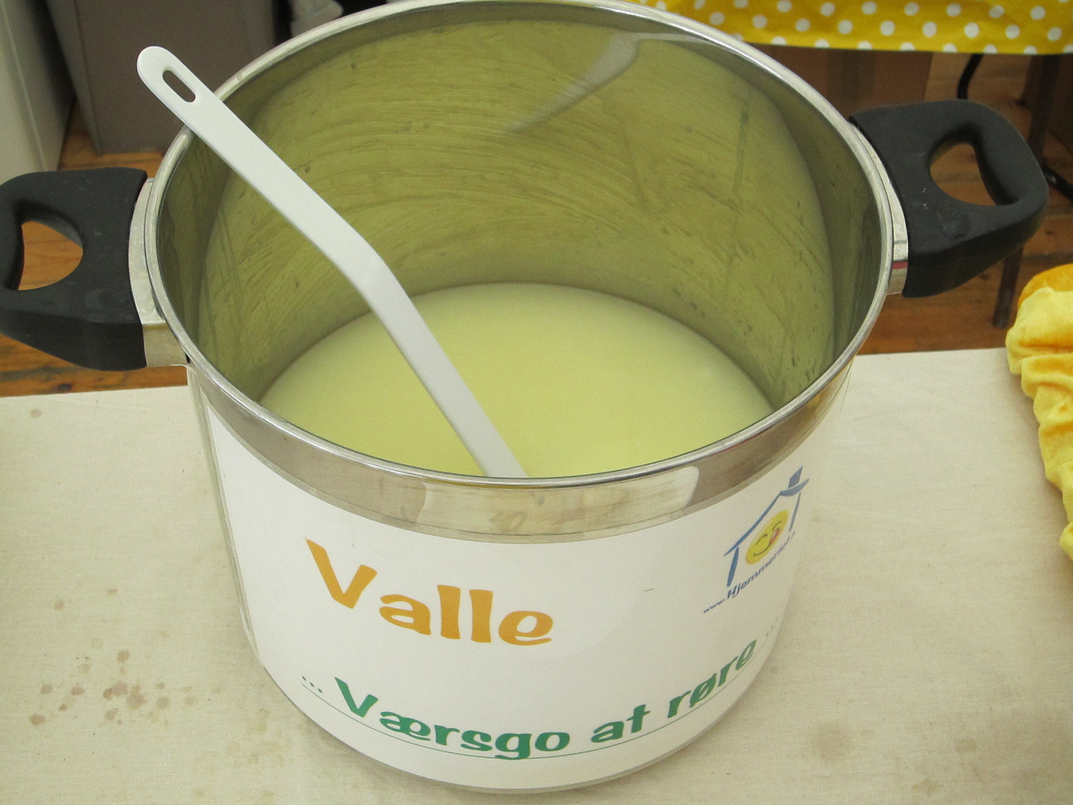 Efter cirka ½ time er mælken koaguleret. Gryden står med låg og klæde over. |